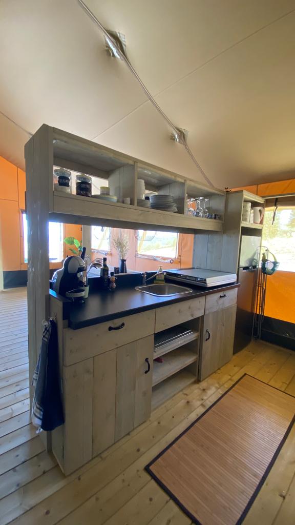 Esta acogedora y totalmente amueblada tienda de campaña de safari tiene una sala de estar de aproximadamente 40 metros cuadrados con suficiente espacio para estar en toda la tienda y una terraza maravillosamente espaciosa con toldo. La cocina totalmente equipada con inventario tiene una estufa de gas de cuatro quemadores asegurada térmicamente. El baño tiene un inodoro, una lavamanos y una ducha. Una cabaña para dormir tiene una cama doble y la otra cabaña para dormir tiene una litera.