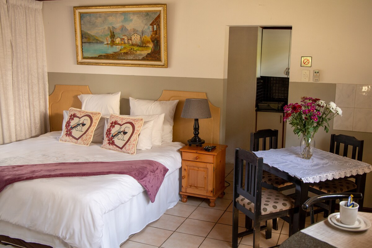 Cottage 1 is an open-plan unit furnished with a king-size bed and has an en-suite bathroom fitted with a shower. The unit is equipped with a fan, bar fridge, microwave, tea- and coffee-making facilities, and a TV with selected DStv channels.