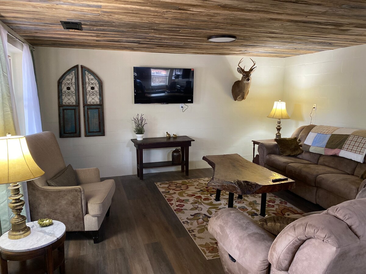 Esta es una pequeña cabaña en el centro de la ciudad. Se trata de una planta abierta con 1 cama tamaño king, 1 sofá y camas plegables disponibles bajo petición. Disfruta de la comodidad de poder caminar a todo en la ciudad y de la serenidad de un espacio temático rústico. A pocos pasos de algunos edificios bellamente restaurados y convenientes para el lago de la ciudad y los senderos para caminar. No se admiten mascotas ni se permite fumar en el interior.