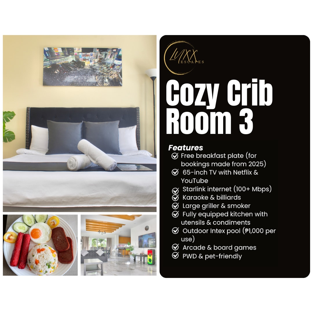 Perfect for families or small groups, our house features: • 1 air-conditioned room (sleeps up to 6 guests) • 1 airconditioned room (sleeps 2 guests) • Fully equipped kitchen • Fast Wifi (up to 200 Mbps) • 43” Smart TV with Netflix • Laundry area with automatic washing machine Just a 5-minute walk to the National Road, 📍700 m Yes Hotel 📍600 m McDonald’s. 📍750 m Centromall 📍4.4km LISP 📍2.9km Mapúa Malayan Colleges 📍10km Enchanted Kingdom Shuttle and bus terminals are nearby too!
