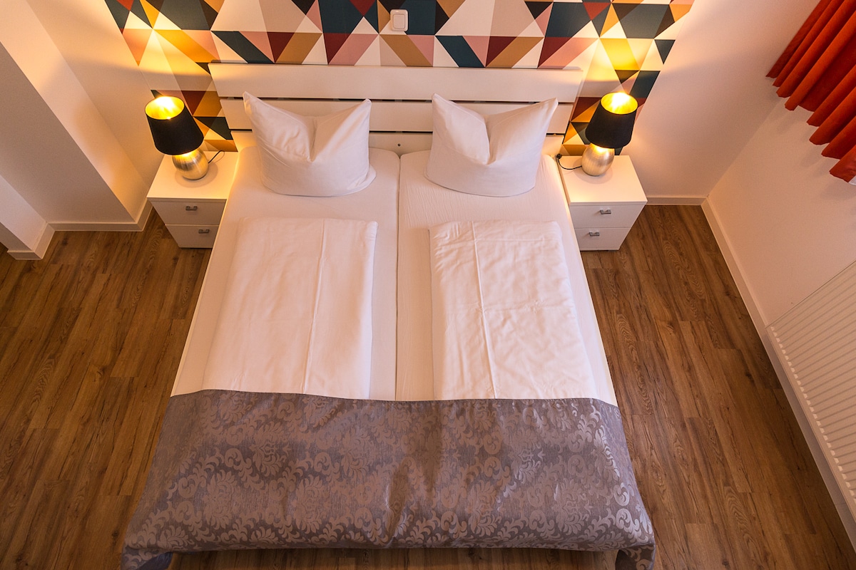 Apartamento en un lugar tranquilo y sin tráfico. A solo 15 minutos de la ciudad o el casco antiguo y 5 minutos de la sala de conciertos. Equipado con mininevera y hervidor de agua; mesa para 2 personas y TV. Baño privado con inodoro y ducha Amplio desayuno por 9,80 €/ persona previa solicitud