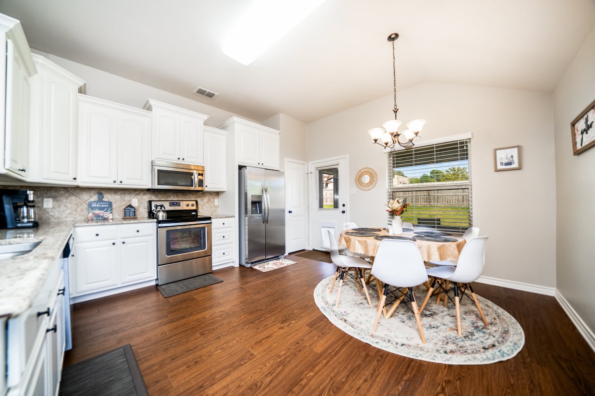 Stay at Modern Comfort, a beautifully updated 3-bedroom, 2-bath home in Longview, Texas. This family-friendly space features an open layout, abundant natural light, and a cozy electric fireplace. Enjoy a private, fully fenced backyard complete with a furnished, fully covered patio on a quiet one-way street within walking distance to parks and ballfields. Modern Comfort offers a relaxing, convenient stay just minutes from downtown, dining, and shopping.