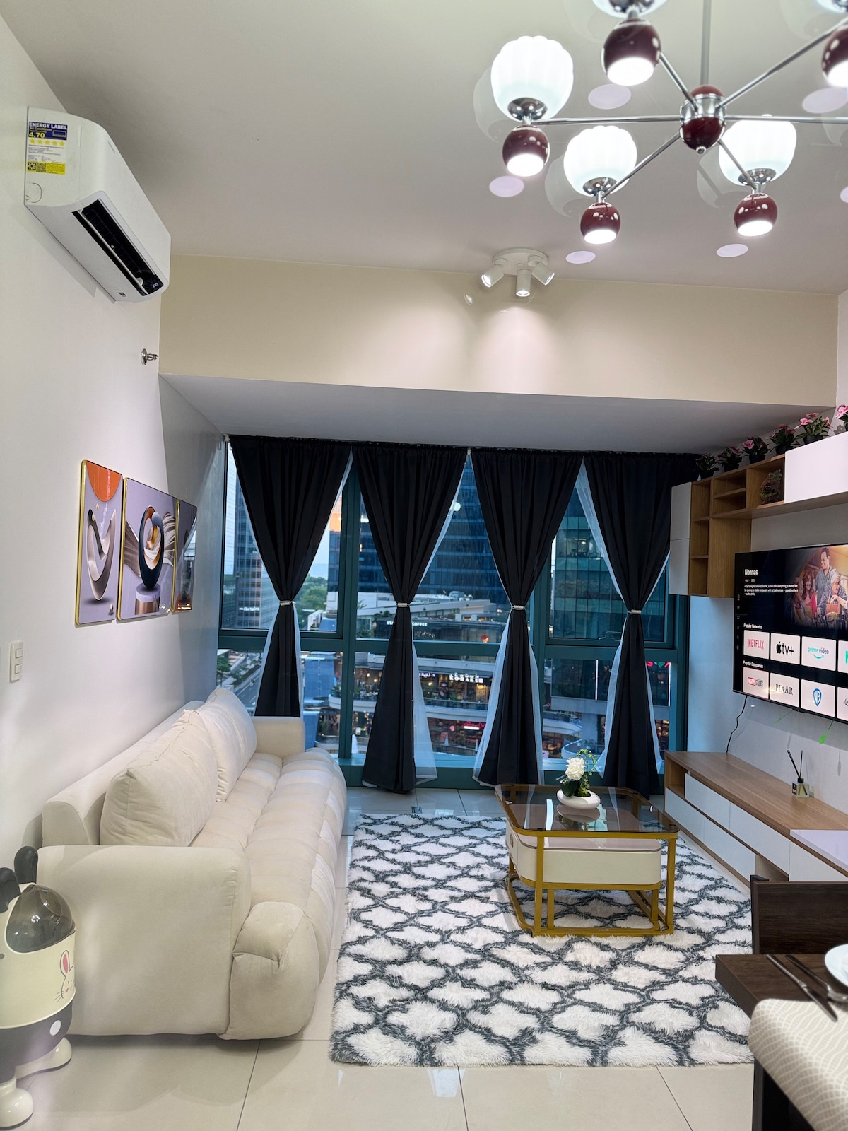 Libérate del estrés del trabajo y encuentra serenidad en nuestro apartamento en Uptown BGC, cerca de Uptown Mall y Bonifacio High Street. Envuelto en un ambiente bohemio, revive tus recuerdos paradisíacos dentro de la bulliciosa ciudad de BGC en nuestra acogedora sala de estar completa con un cómodo sofá y un televisor Sony 4k de 65 pulgadas. Disfruta del lujo de Uptown BGC, mientras contemplas la pintoresca vista de la ciudad en nuestro asombroso balcón. Unas vacaciones bien empleadas para un huésped que se lo merece. Solo aquí en Sojourn Home BGC.