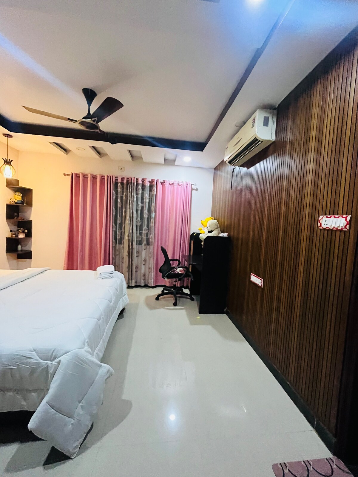 Relax and unwind in this modern, fully furnished 3BHK designed for comfort and peace. The flat features a spacious living area, cozy bedroom, AC, stylish lighting, and a balcony with open views. Ideal for business travelers, couples, and families looking for a calm yet well-connected stay. Clean, secure, and thoughtfully maintained to make you feel at home.