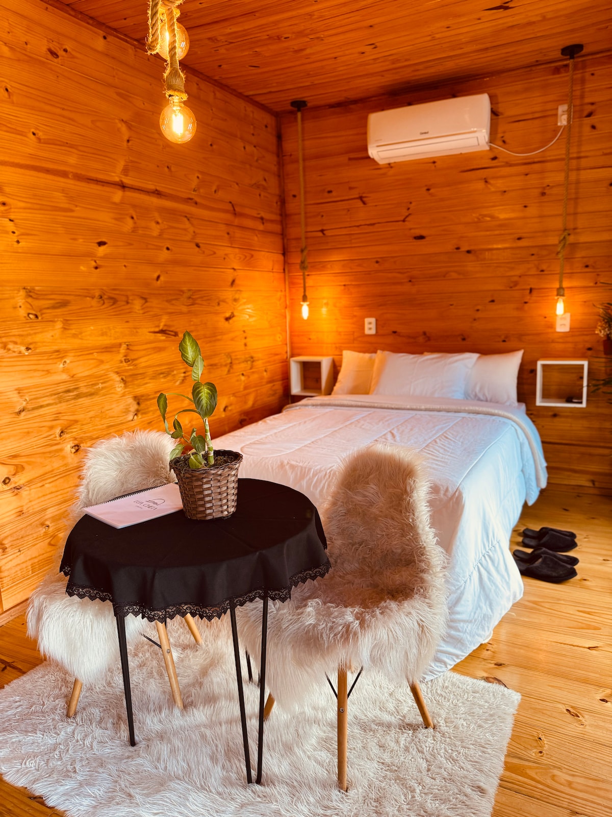 Chalet para aquellos que buscan una experiencia acogedora, tranquila y centralizada (bien ubicada). Completo con chimenea interior fácil de usar, aire acondicionado frío y calor, TV inteligente, cocina completa, cama doble extremadamente cómoda y muchas mantas disponibles. Se encuentra a 3 minutos del centro de la ciudad, donde se encuentran todos los mercados, panaderías, restaurantes y farmacias. También tiene fácil acceso a todas las atracciones turísticas.