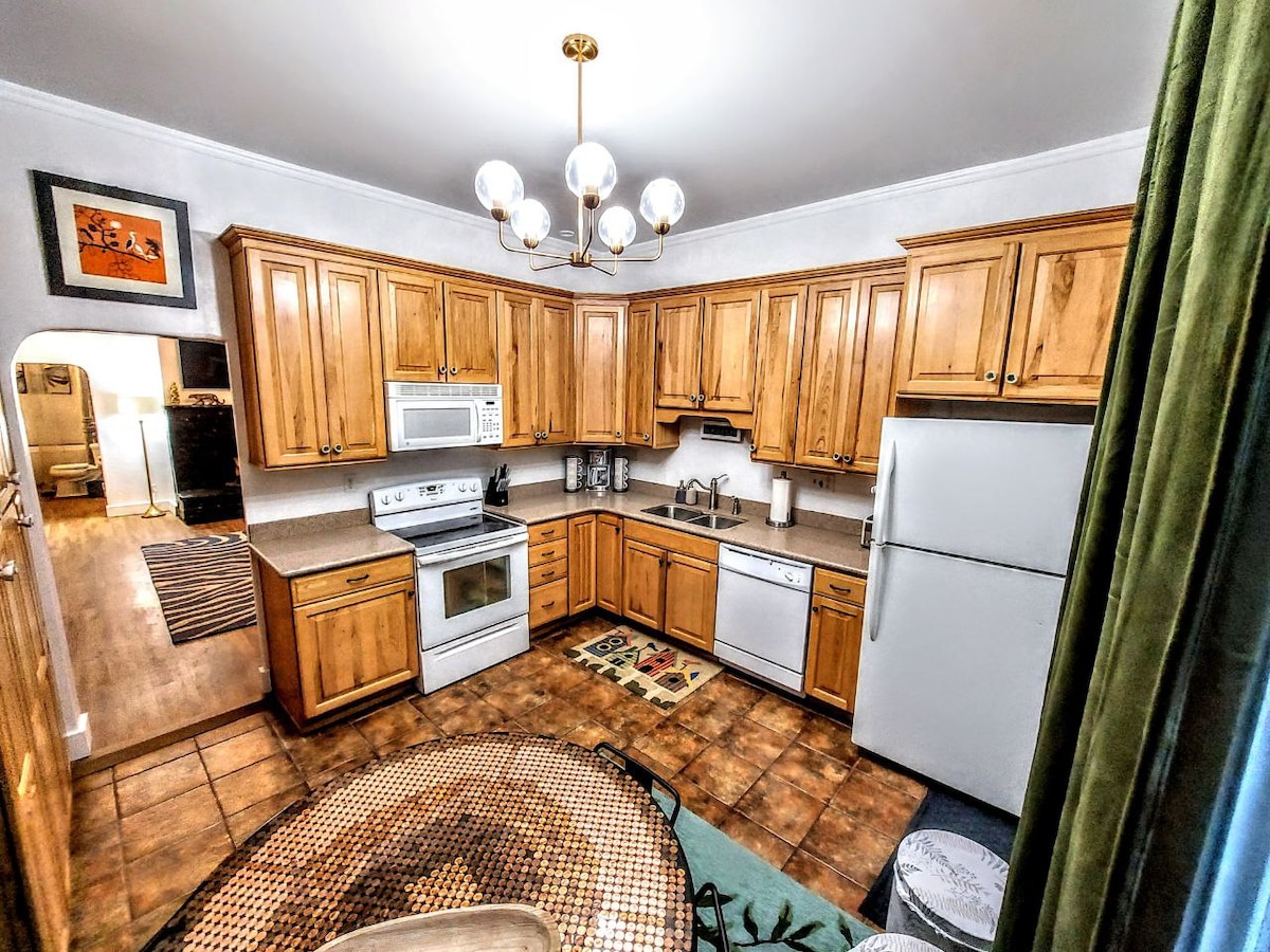 ¡Ubicación inmejorable oculta, tranquila y segura con una larga entrada privada! ¡3 camas tamaño king! 2 dormitorios privados con cama tamaño king y 1 sofá cama para 2 personas en la planta superior. Abajo hay un área común con 1 cama tamaño king y 1 individual. ¡El baño de arriba tiene 2 duchas separadas! ¡1 pequeña y 1 encima de una bañera grande! La planta baja tiene un baño de 1/2 (solo inodoro y lavabo) ¡Todos los colchones premium! ¡Estacionamiento privado! ¡En el centro! Ubicación tranquila y segura. Se adapta bien a 8, ¡9 es apretado! Esta es una casa antigua y peculiar que ha sido renovada y actualizada con buen gusto.