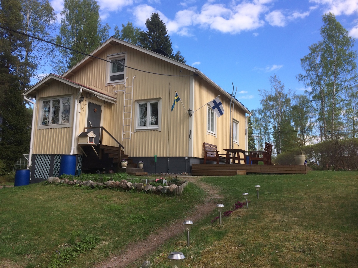 This cozy cottage welcomes you to spend relaxing get-aways and longer remote work stays in the middle of beautiful and peaceful finnish nature. Cottage has two spacious cabins, a well-equipped kitchen, and a good sauna. The charming swimming pond is just a few steps and stairs away from the cottage. There is good wifi, big sunny lawn and no neighbours in sight - so you can swim in your birthday suite if you want :) The nearest grocery store is 12 min ride away.