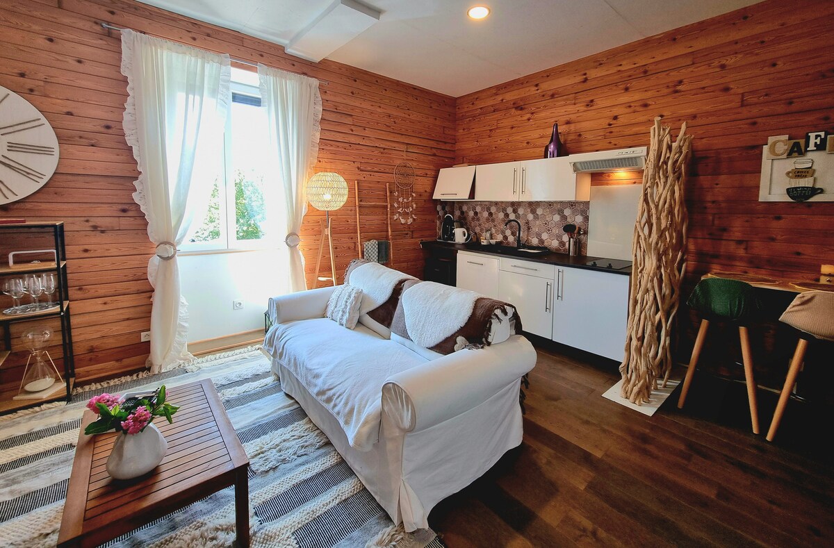 Notre gîte, au milieu des vignes avec sauna et jacuzzi privatif se compose d'une grande pièce de vie avec cuisine tout équipée (cafetière nescafé et dosettes fournies),d'un canapé lit, une salle d'eau ainsi qu'une grande chambre avec un lit 160×200. Vous pourrez également profiter d'une grande terrasse dominant le vignoble. Une pergola bioclimatique vous permet de vous détendre dans le jacuzzi toute l'année. Un sauna tonneau est aussi à disposition sur la terrasse.