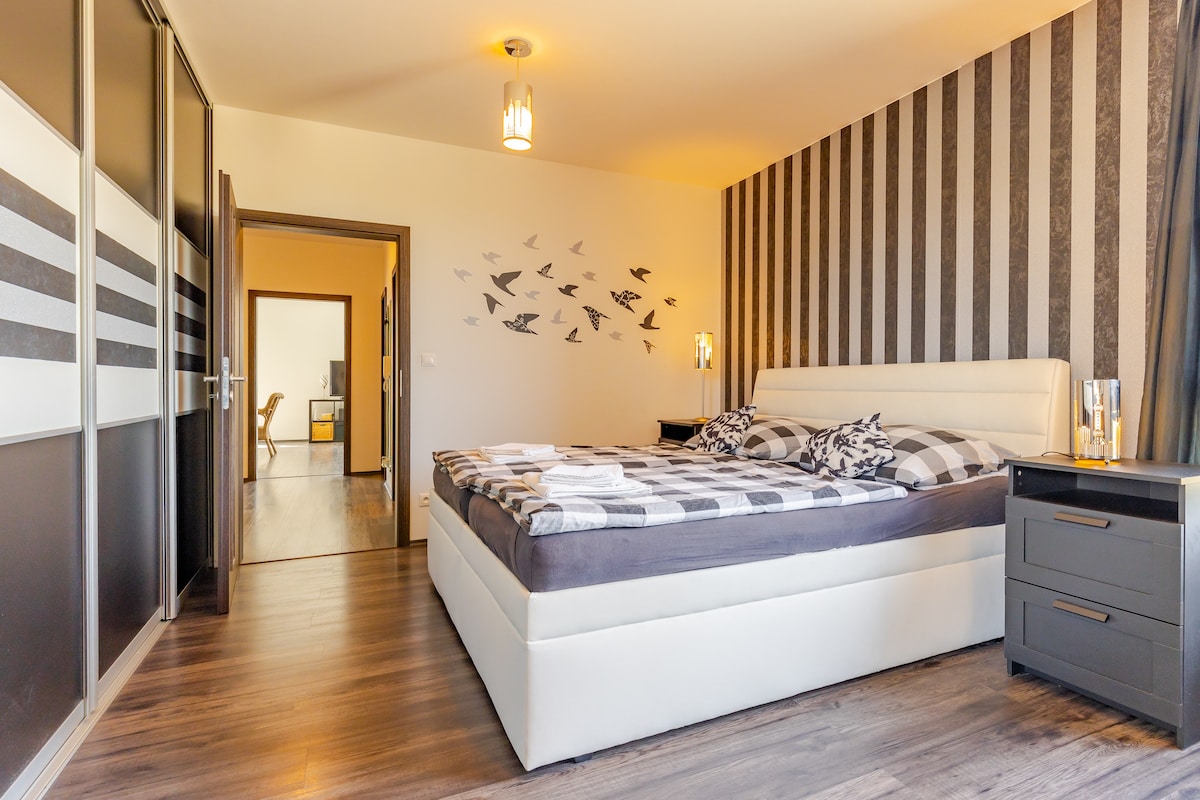 Užite si váš pobyt v našom novom, kompletne zariadenom 2-izbovom byte s balkónom s príjemným výhľadom. Parkovacie miesto je v cene prenájmu. Byt sa nachádza iba 10 min. pešo od letiska a 5 min. od bus zastávky. Potraviny sú 2 min pešo. Byt disponuje obývacou izbou s rozkladacou sedačkou a spálňou s manželskou posteľou, je vhodný pre max. 3 osoby. Balkón s výhľadom na mesto je perfektným miestom pre rannú kávu alebo večerný pohár vína. V blízkosti je nákupné centrum Avion, diaľnica.