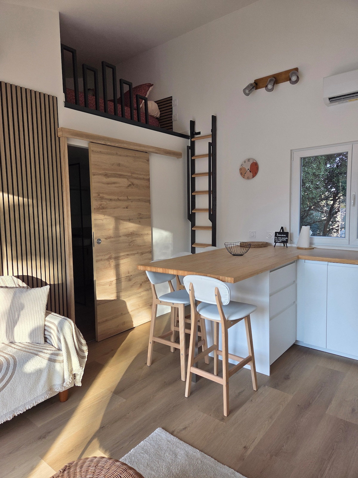 Este estudio nuevo clasificado 2** se encuentra en Drôme Provençale, a 10 minutos de Grignan; de la Abadía de Aiguebelle de la Granja de los cocodrilos, 45 minutos de el Ardèche , del Palacio de los Papas , los encajes de montmirail . Nuestra casa está adyacente a la masía provenzal de los propietarios, sin vecinos. Cocina y sala de estar en la planta baja; el altillo está compuesto por la cama, la ducha, el lavabo y el inodoro, que están contiguos con separación y abiertos al dormitorio del altillo. Terraza privada. SERVICIO DE BICICLETAS a 200 m