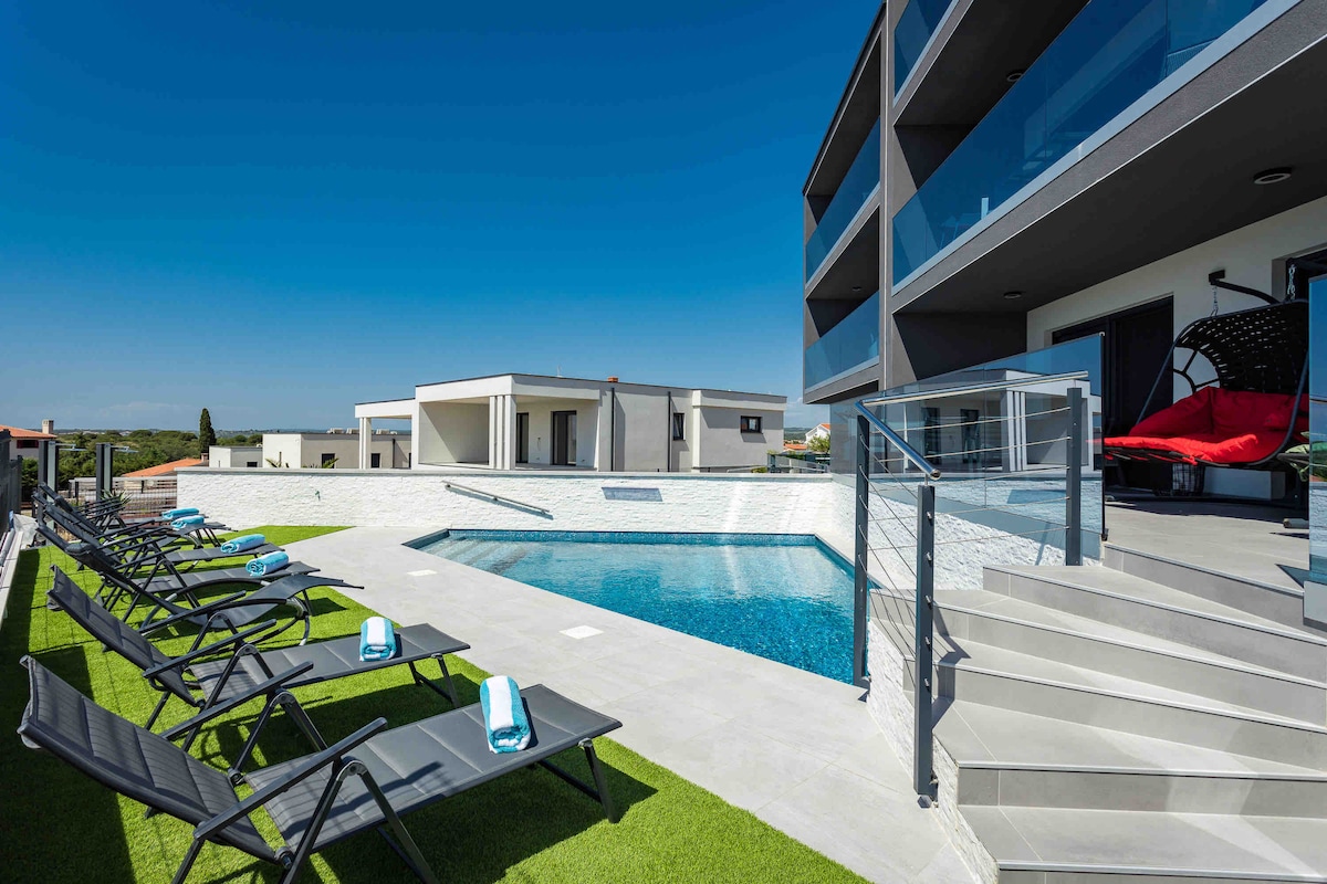 ¿Buscas paz y cercanía a la ciudad y unas vacaciones activas? ¡Entonces somos la opción perfecta para ti! Ubicado cerca del pueblo de Pula en los tranquilos alrededores de Valdebek. Una nueva casa moderna con su propio patio trasero,piscina, jacuzzi, parque infantil a la sombra de los olivos será tu oasis. En la primera planta hay tres dormitorios con baño privado,y en el primer piso hay un salón con cocina,comedor y un pequeño aseo. Sé un huésped querido y relájate con tu familia y amigos en nuestro acogedor lugar
