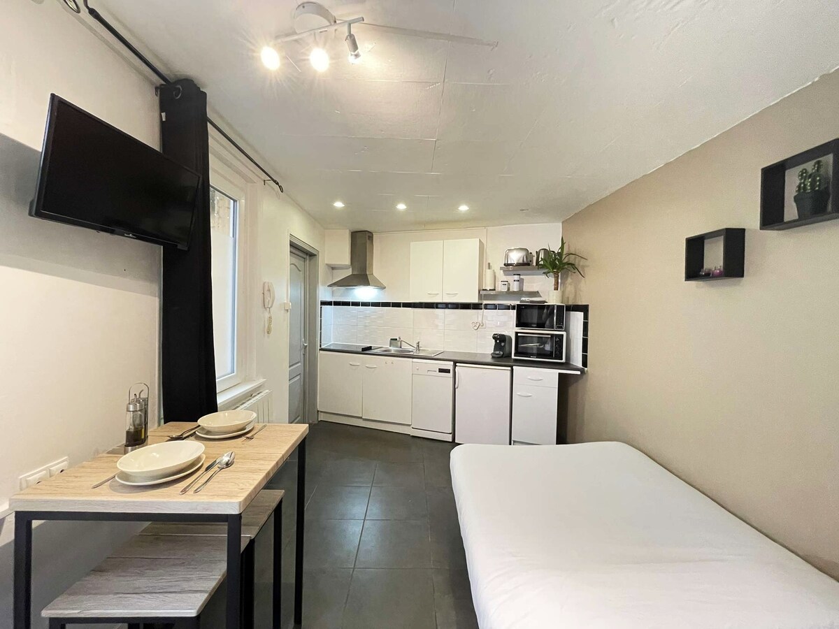 T1 luminoso en pleno centro de Valenciennes, a dos pasos del museo. Ideal para una estancia en solitario, en pareja o con amigos. El apartamento tiene un dormitorio cómodo, TV inteligente con Netflix, una cocina equipada, un baño moderno y dos balcones contiguos para disfrutar del exterior. Cerca de comercios, restaurantes y transporte. ¡Todo está reunido para una estancia práctica y agradable!