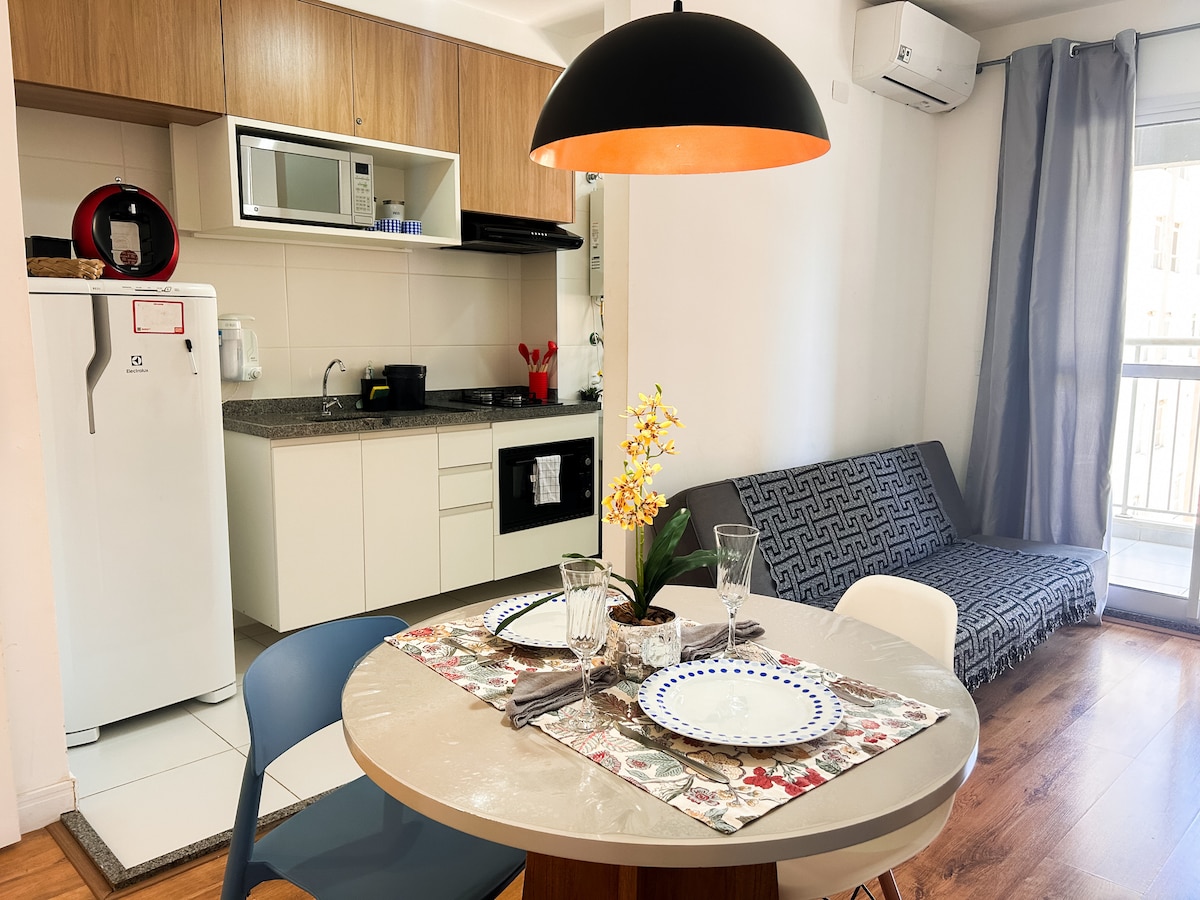 ¡Te damos la bienvenida a tu hogar temporal en Campinas! Nuevo apartamento, con 500 Mega Wi-Fi, espacio de garaje y excelente ubicación, cerca de Cambuí y Centro. El edificio, entregado en 2022, cuenta con piscina, gimnasio, sala de juegos, espacio infantil, minimercado y conserje 24 horas. Ideal para aquellos que buscan comodidad y practicidad. El apartamento tiene cocina equipada, balcón, aire acondicionado, TV de 55" y ducha de gas. Perfecto para aquellos que han venido por trabajo o por jugar. Será un placer darte la bienvenida.