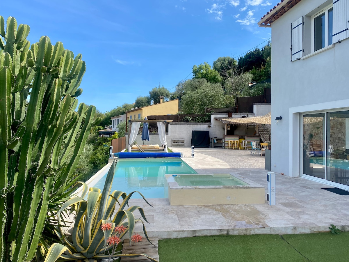 Piscina tranquila para huéspedes de libre acceso para ti y para nosotros. 2 habitaciones, cuarto de ducha y aseo. Cocina totalmente equipada. Aparcamiento justo al lado del alojamiento. Cerca del pueblo, a 15 minutos a pie. A 25 minutos en coche del Aeropuerto Internacional de Niza y a 15 minutos en coche de la estación de tren. Autobús a 5 minutos a pie. Wifi gratuito. Estaremos encantados de recibirte. En algún momento, comparte la comida familiar/aperitivo con nosotros el fin de semana.