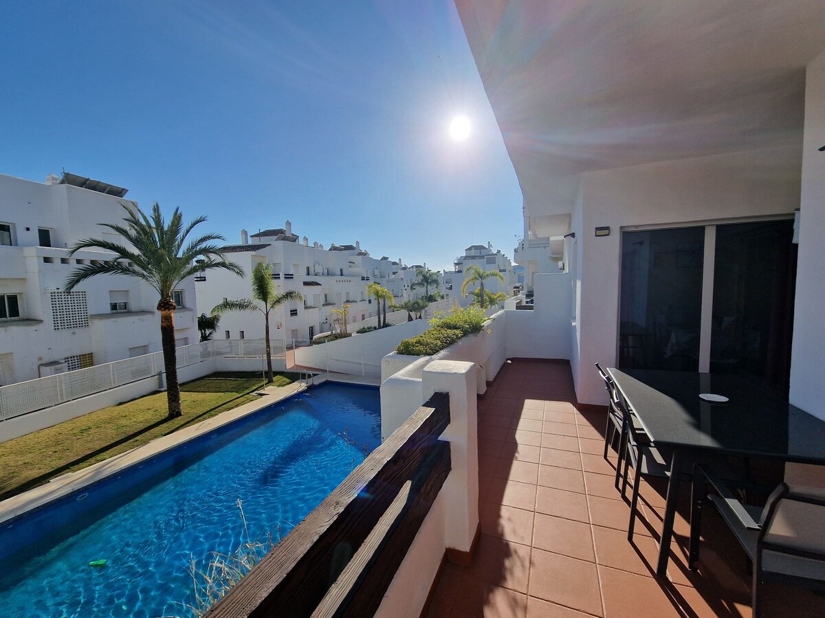 Dentro del complejo VALLE ROMANO, a solo 5 minutos de la playa en coche, el apartamento ofrece una terraza con vistas abiertas al golf, estacionamiento privado y 2 piscinas al aire libre. El apartamento con aire acondicionado incluye una cocina totalmente equipada, una sala de estar/sala de estar, 2 dormitorios: uno principal con cama doble y baño con bañera. El segundo dormitorio incluye 2 camas individuales y 1 baño en suite con ducha. Se proporcionan toallas y ropa de cama.