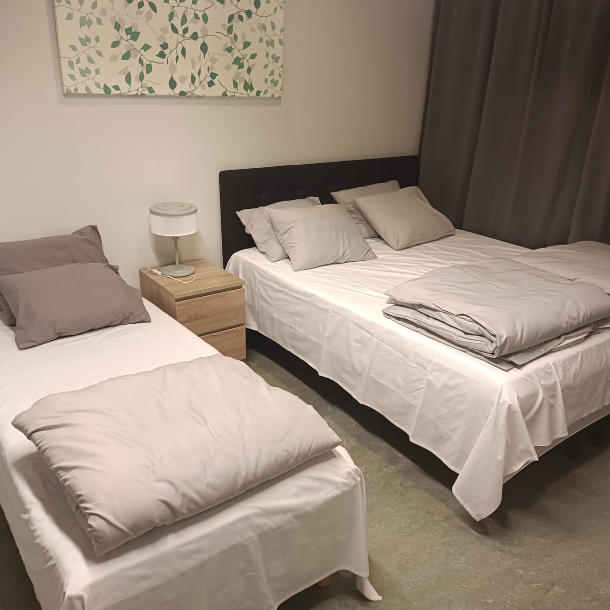 Habitación de hostal para 2 personas cerca del aeropuerto de Helsinki. La habitación está equipada con platos, refrigerador, horno microondas, cafetera y hervidor eléctrico. Cocinas comunes, inodoros ordenados, duchas y lavanderías en el hostal. Hay un estacionamiento de pago. La ropa de cama, las toallas y el wifi están incluidos en el precio. El aeropuerto está a 2 kilómetros. La estación de tren está a un kilómetro de distancia. Se puede llegar al centro de la ciudad de Helsinki en tren en 30 minutos.