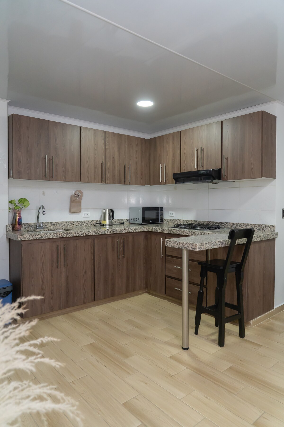 Relájate con toda la familia en este tranquilo lugar con opciones de acomodación hasta 6 personas. Apto con habitación doble con baño privado, habitación cuádruple y acceso a cocina completamente equipada, sala, lugar para trabajar y zona de lavado, todo a escasas 2 cuadras del parque nacional del folclor y frente a la estación de policía para completa seguridad. Opción de parquear frente a la casa en vía cerrada. Anímate a conocernos