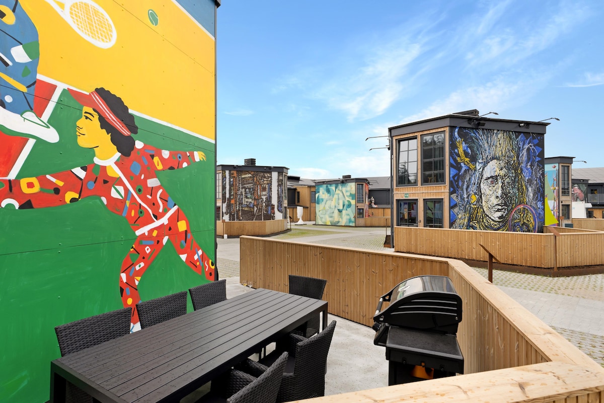 Fun Art in Blokhus is more than just an activity park with innovative holiday homes – it’s an experience for the whole family! Here you will find not only modern homes styled like Tiny Houses but also a range of activities such as a trampoline park, a play area, street art, and a ceramics workshop, as well as concerts and much more. Fun Art is located in the picturesque surroundings of Blokhus and offers entertainment and fun for both children and adults. The homes are adorned with street art murals, giving them a unique appearance, while the interior follows the Tiny Houses concept. On arrival, bed linen packages are provided, and you can choose between room service, dining at Fun Art’s restaurant, or grilling on your own terrace. Accommodates 1-6 people. Details About the Holiday Homes The homes can accommodate up to 6 people and are designed with comfort and functionality in mind. The four bunk beds on the first floor can be folded away if there are fewer guests, creating extra space and giving the home a cool, practical style. Every square meter of the homes is optimally utilized to provide you with a comfortable base for your stay near Blokhus in an artistic environment. On the ground floor, you will find a well-equipped kitchen/dining area, a bathroom, and a lovely terrace. All necessary amenities are provided, including a dishwasher, washing machine, tumble dryer, and grill. During concerts and events, staying in this creative atmosphere will be an extra special experience. Additionally, there are electric car charging stations. All homes are smoke-free. Activities for the Whole Family When you rent a holiday home at Fun Art, you get free access to all the park’s activities, allowing you to enjoy a vacation filled with both relaxation and exciting experiences. The area around Blokhus offers beautiful nature, one of Denmark’s best beaches, and popular holiday destinations as well as Fårup Sommerland, one of Europe’s top amusement parks. With so many options for activities and experiences, there is something for the whole family, so no one will get bored. Combine a day at the beach with fun experiences at Fun Art – enjoy a quiet moment in the ceramics café, challenge yourself on the football golf course, jump on the trampolines, or experience a concert in the large concert hall where you can also dine and get VIP seats on the balcony. At By Sommerhuse, we believe that Fun Art is the perfect place for a holiday in Blokhus, taking the standard of holiday home rentals to a new and modern level.