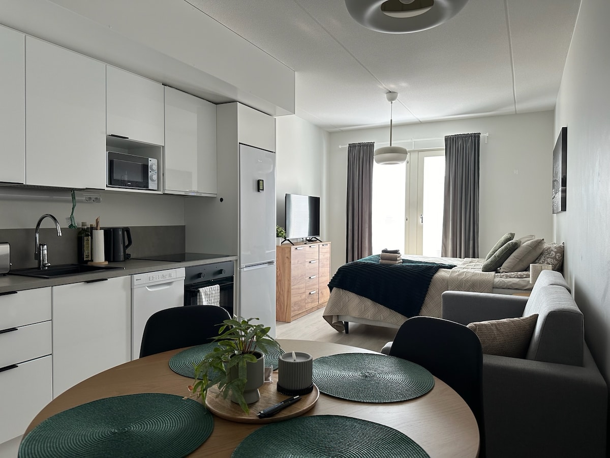 The cozy new studio apartment, as the premises of the old daycare kindergarten become a living space, offers the whole apartment with its own entrance. Protected wooden house is located next to the southwest park (lounaispuisto), close to universities, cultures and downtown services. The apartment has its own parking space with a thermal plug and check-in is at the entrance of the apartment with a one-time code. The apartment is very well equipped and ideal for short and long term accommodation.