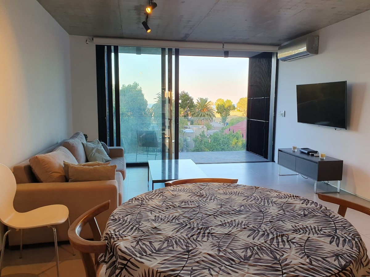 Relájate en este espacio tranquilo y elegante. El area de dormitorio ofrece la posibilidad de tener 2 camas individuales o una cama Queen. En la sala el sofá de transforma en una cómoda cama. La cocina tiene todos los elementos necesarios para preparar tus comidas. El departamento se encuentra cerca de muchos medios de transporte y accesos rápidos. El barrio tiene una bohemia propia, variados lugares para comer, podes hacer caminatas hasta la costa del río, recorriendo sus bellas calles