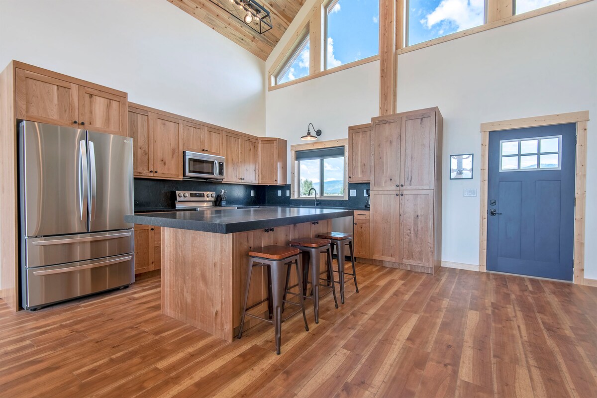 The Aspen Grove house is a modern/rustic home with a cabin feel. Nestled at the bottom of Pine Creek Pass, 4 miles west of Victor, Idaho. The neighborhood is secluded and quiet. You can walk out the front door for a beautiful view of the Grand Tetons and amber ways of grain. The home is naturally cool in the summer and cozy in the winter. The windows look out on aspen and chokecherry trees that glow red and yellow in the fall. Amenities are endless!