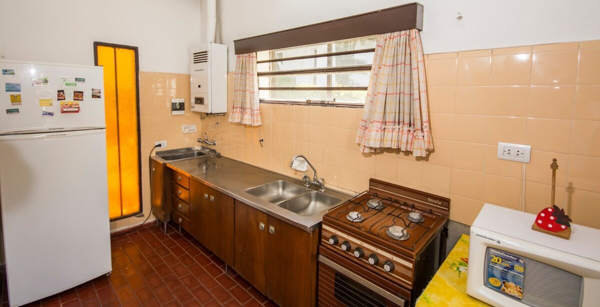 Relajate en este alojamiento único y tranquilo. A 300 mts del centro y comercios. Chalet de 3 ambientes totalmente equipado (Heladera con freezer, cocina con horno, vajilla, horno microondas, Smart TV c/DirecTV, a/a, ventiladores, etc) Cofre de seguridad, WiFi, cochera y parrilla. Gran parque de 15.000 m2 arbolado con senderos, colinas y bosquecitos y gran piscina cercada. Complejo totalmente Cerrado con Alambrado perimetral y porton automatico a control remoto.