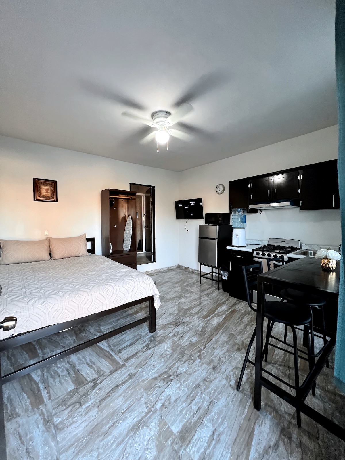 Estudio con Terraza y Vista a Tecate – A Solo 2 Minutos de la Garita Hospédate en este amplio estudio de 100 m² para hasta 4 personas, ubicado en el corazón de Tecate. Perfecto para una escapada relajante, un viaje de negocios o un cruce rápido a USA. Características principales: Cama matrimonial cómoda y sofá cama Cocina totalmente equipada Baño completo privado WiFi + TV Terraza con vista panorámica Ubicación privilegiada: a solo 2 minutos de la garita internacional y cerca del centro.