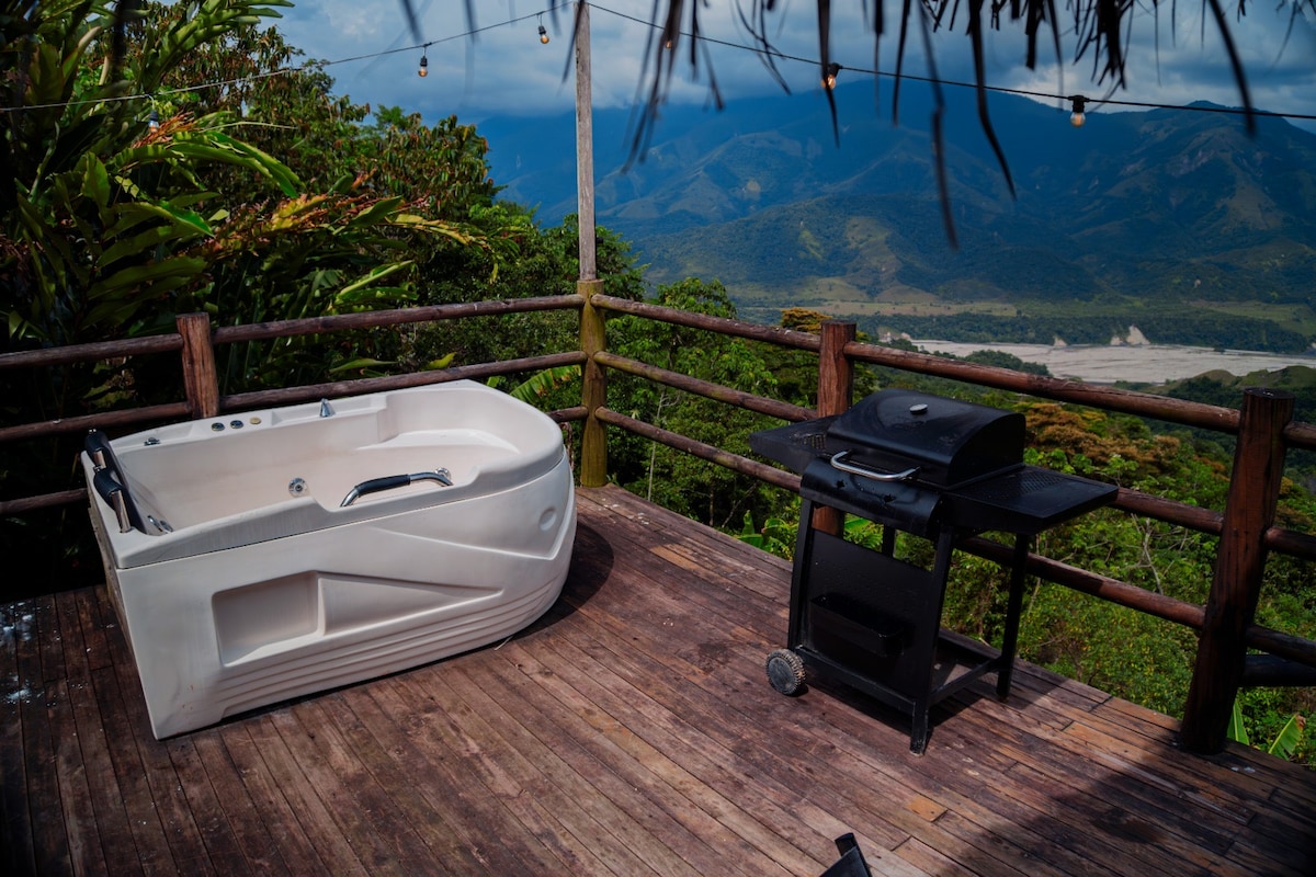 Escápate a la Naturaleza A solo 15 minutos de Villavicencio, esta acogedora cabaña te conecta con la naturaleza. Despierta con el canto de las aves y una vista increíble del Cañón del Río Guatiquía, donde podrás avistar monos y más. Relájate en el jacuzzi, descansa en una cama Queen y disfruta de un espacio ideal para el descanso o el trabajo. Con baño privado y un ambiente rústico, es perfecto para desconectarte y recargar energías. ¡Te esperamos! Desayuno Americano Incluido