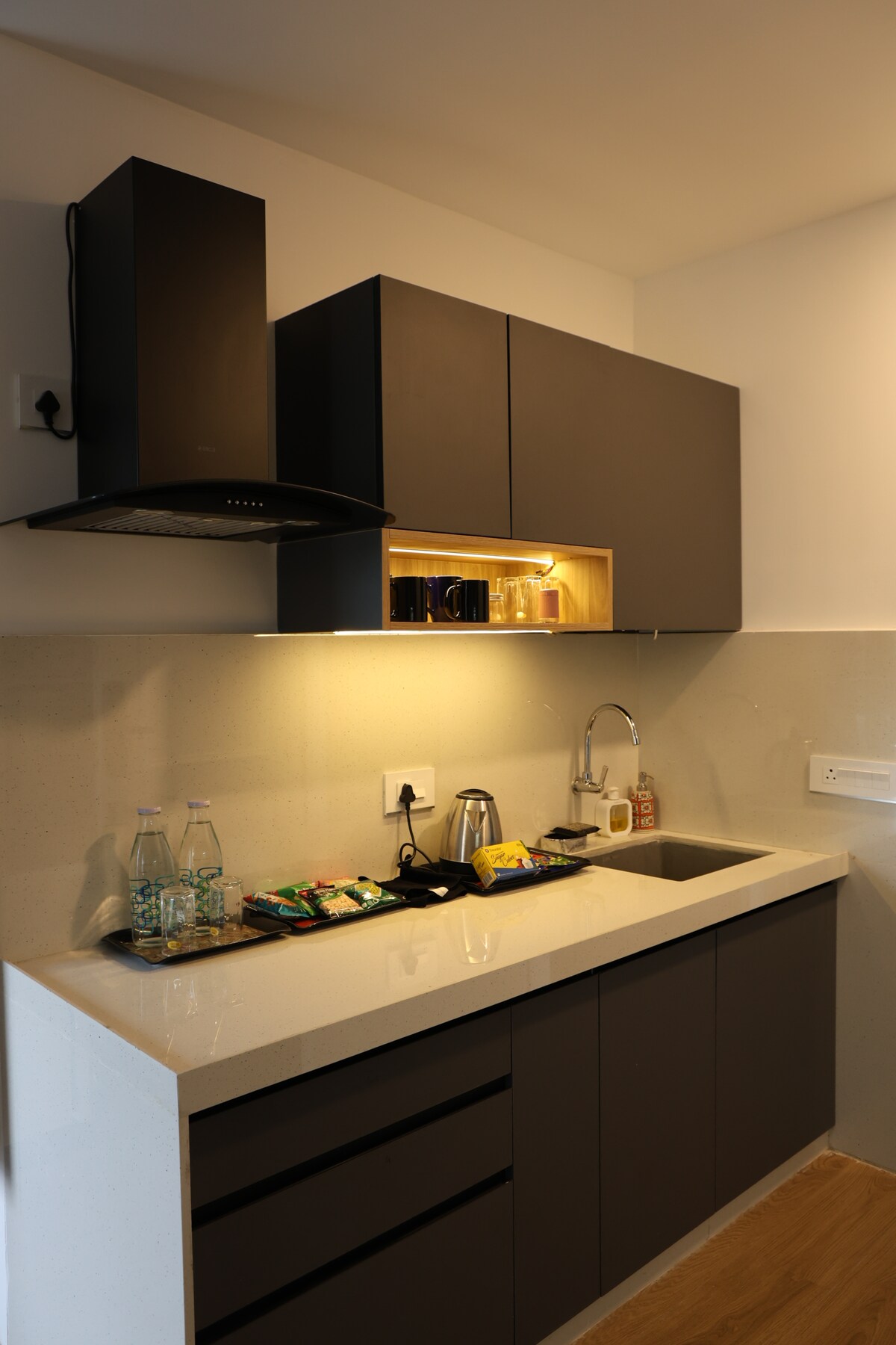 • Cómoda sala de estar: decoración moderna con una lujosa cama tamaño queen, un sofá y un rincón para comer. • Cocina totalmente equipada: perfecta para cocinar o disfrutar de un café por la mañana. • Servicios: wifi de alta velocidad, TV de pantalla plana y aire acondicionado. • Ubicación privilegiada: cerca del transporte público, tiendas y una vibrante vida nocturna. Ya sea que estés explorando las atracciones de Pune, saboreando la cocina local o simplemente relajándote, este estudio tiene todo lo que necesitas para una estancia inolvidable. ¡Reserva ahora para disfrutar de una escapada perfecta!