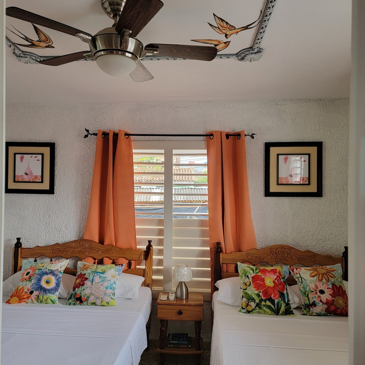 Alojamiento independiente con terraza y vistas increíbles al atardecer sobre las montañas de Viñales. Capacidad para 4 personas con 2 camas matrimoniales, baño privado, aire acondicionado y cocina americana. Ademas del servicio Wi-Fi libre de costo, cuenta con generador eléctrico para cortes de luz, ventilador y luz recargable. Ubicada cerca del centro del pueblo y de rutas naturales. Ideal para familias o amigos que buscan privacidad, comodidad y una experiencia auténtica.