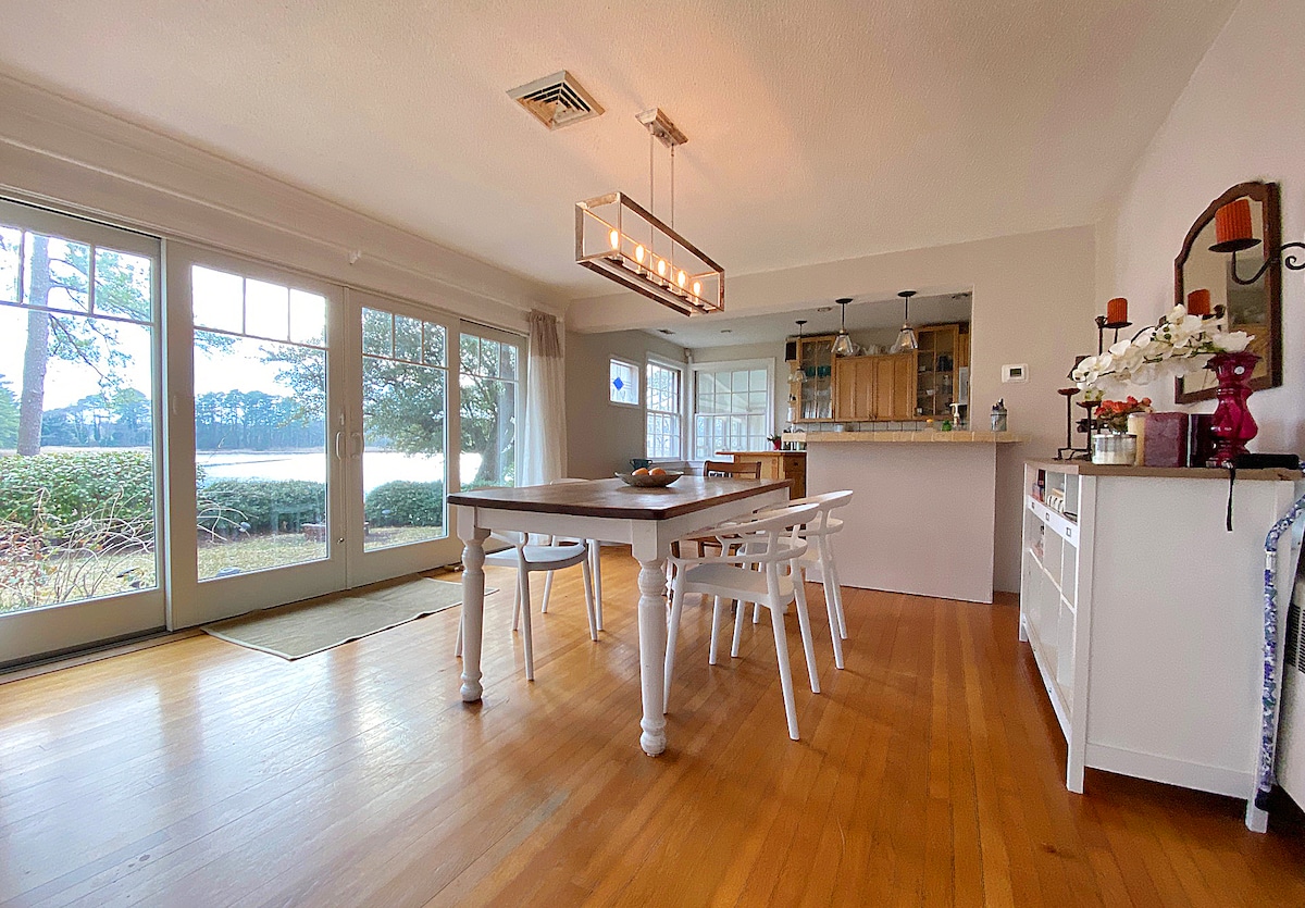 ¡Un hermoso paraíso aislado! Respondemos rápidamente. Esta espaciosa y acogedora casa de campo para no fumadores tiene unas vistas estupendas del río Elizabeth. Está a 5 millas del centro de Norfolk y a 5 minutos a pie de una parada de tren ligero cercana. Un pase de un día cuesta 4,50 dólares, incluido un ferry a Portsmouth. Servicios increíbles Interior renovado. Hermosa chimenea. Piso nuevo/cocina totalmente equipada. Huevos orgánicos frescos/yogur/refrigerios/zumo/café incluidos Wifi, TV por cable y HBO Barra de sonido con bluetooth Ropa de cama de lujo Nuevo solárium con vistas al agua. Lavadora/secadora
