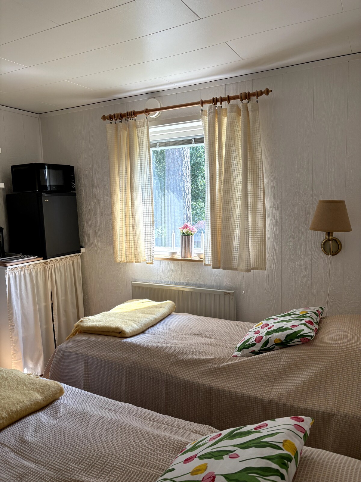 Bienvenido a la exuberante Själsbo, en el campo, cerca de la ciudad. Puestas de sol mágicas, hermosos paseos junto al mar. Nadar por la mañana en el puerto, día en la playa de Brissund. Fika en la panadería Själsö. Cena en Krusmyntagården y baño nocturno de camino a casa al atardecer. Un poco como un hotel con camas hechas, toallas, jabón encantador, champú y acondicionador y no tienes que limpiar cuando te vas. Acogedor, fresco, pequeño pero espacioso, dormitorios privados (2) + sofá cama, patios al aire libre, aparcamiento, carga de coches eléctricos, 4 bicicletas de las cuales 1 tándem. ¡Aquí lo disfrutamos!