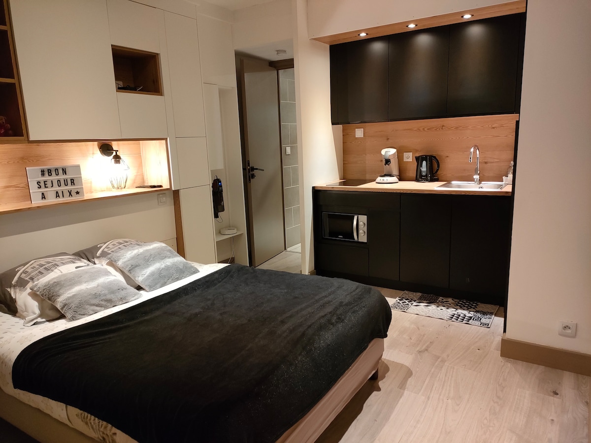 Alquilo encantador estudio de 29 m2 muy soleado en la planta baja en una residencia segura. En pleno centro de la ciudad a 150 metros del parque de verdure,y de la calle Chambéry con todos los comerciantes.Cerca de la estación de tren y las termas.Totalmente amueblado,funcional con todos los electrodomésticos nuevos. Sofá cama rápido convertible 160x200cm.Ropa de cama fourni.Fibre+TV con Netflix integrado(conexión con su cuenta).Proximidad casino.Cerca de las estaciones de esquí:Savoie Grand Revard y Féclaz(25 min en coche)