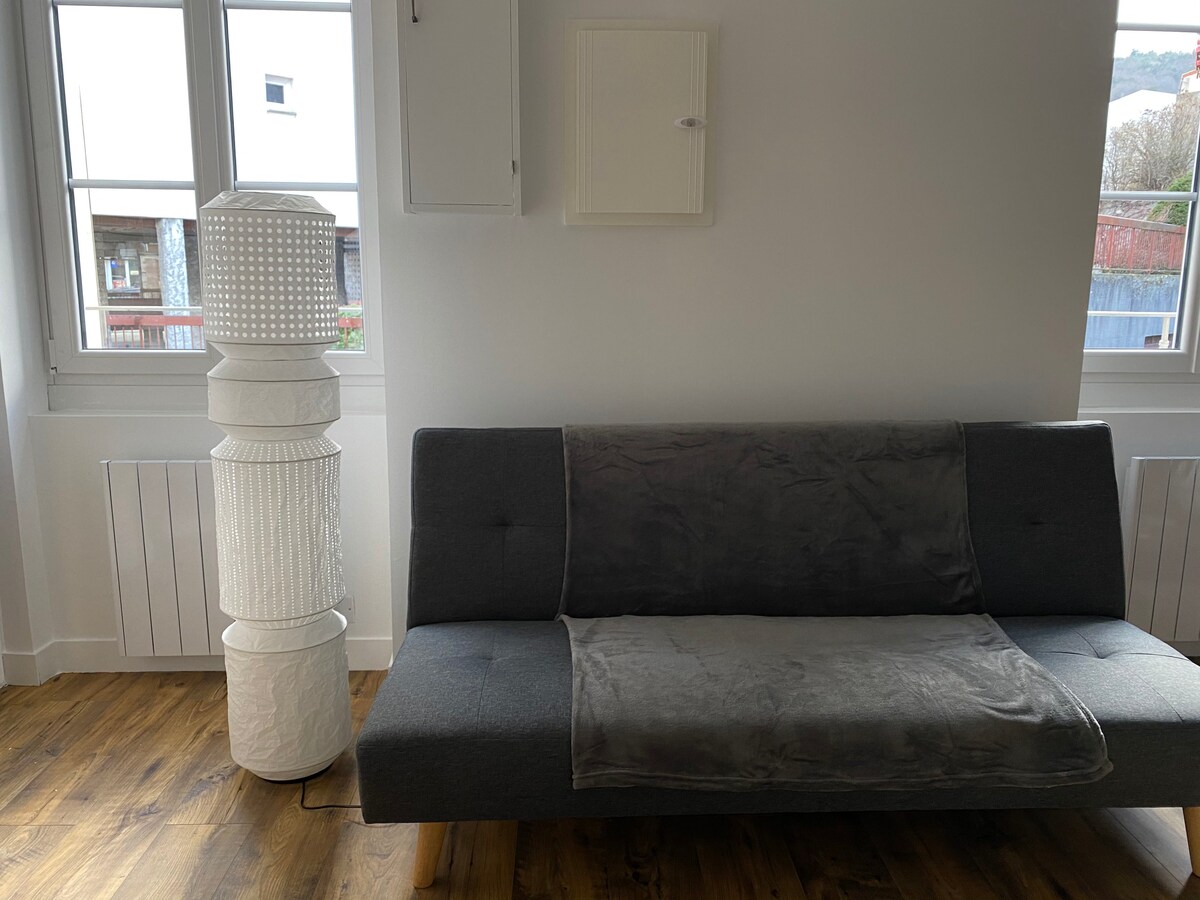 Situado en Royat, disfrute de un alojamiento elegante y céntrico totalmente equipado( microondas grill, vitrocerámica, lavadora,wifi box fibra, Senseo...) Situado a 8 minutos de la plaza de Jaude en autobús , a 50 metros de las Termas, de Royatonic (zona de baño para relajarse) y del Casino de Royat Ideal para estancias de curación. El transporte está disponible a 50 metros (línea B directa a la estación de tren SNCF) El aparcamiento del Panoramique des Dômes se encuentra a 7,5 km y a 14 km de Vulcania.