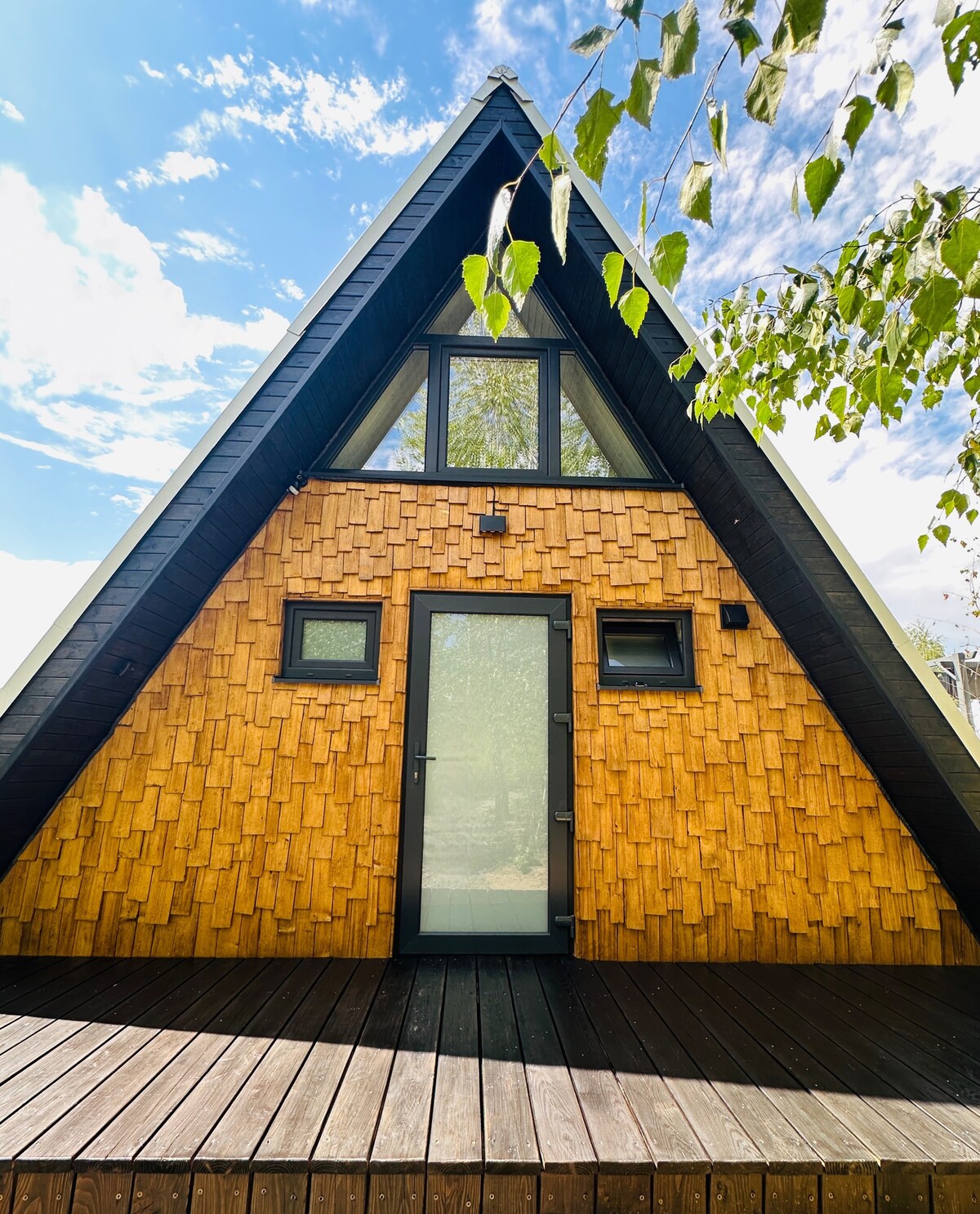 Dobrede es acogedoras cabañas triangulares bajo el bosque, en una propiedad privada con un lago, un mirador y áreas de barbacoa. Cerca hay un arroyo y un río, lo que se suma al encanto especial. Hay una bañera de hidromasaje disponible en el lugar por pre-orden. Cada cabaña tiene capacidad para 4 personas: en el segundo piso hay una cama doble, en el primer piso hay un sofá plegable. Las cabañas tienen una cocina totalmente equipada que te permite cocinar por tu cuenta.