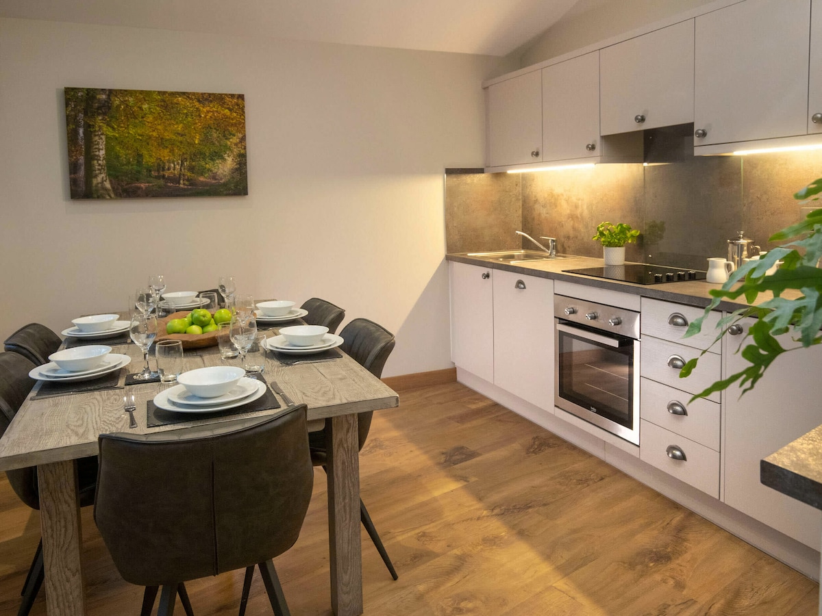 This holiday property is a two bedroom Lodge in the beautiful vale of Llangollen. It has commanding views from a vantage point high up a valley facing south. It boasts contemporary uncluttered styling, underfloor heating and large folding patio doors opening onto a large balcony with table and chairs. This property being on one level is disability friendly with wide doorways however no special equipment is installed. Complementary use of the shared use site hot tub is included in the price.