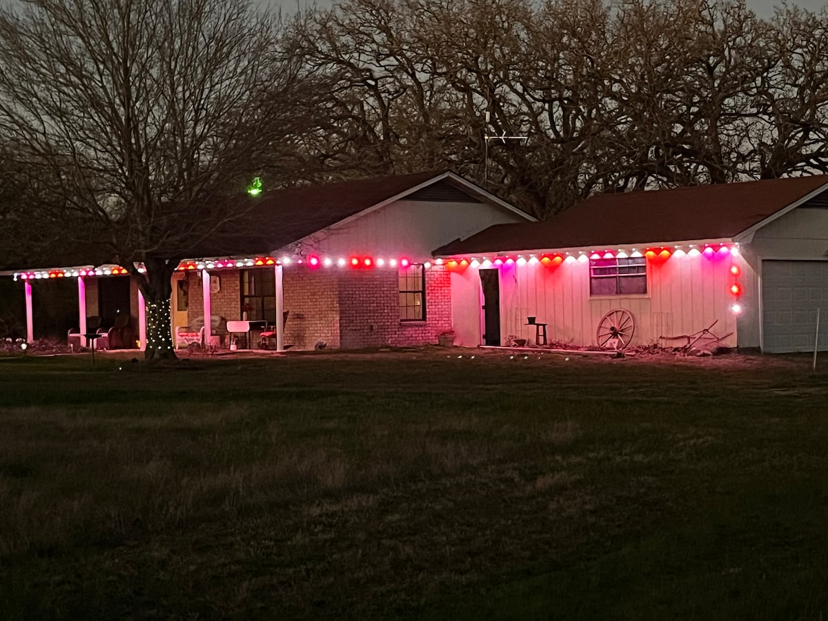 La granja es el destino perfecto para fines de semana familiares, reuniones y viajes de compras en grupo. Techos de doce pies y mucho encanto te esperan en esta casa familiar de 100 años, ubicada en un entorno rural tranquilo. ¡Cocina completa y mucho espacio para relajarse y divertirse! ¡Relájate con una hermosa puesta de sol y despierta con un hermoso amanecer! Convenientemente ubicado a solo 7 minutos de restaurantes elegantes en Brenham, entretenimiento, tiendas y Starbucks. $ 30 por cada huésped adicional después de 4 con un máximo de 11 huéspedes.