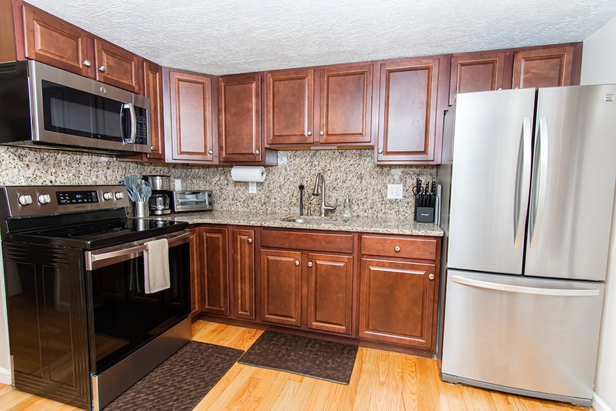 Relax in this peaceful private en suite with breathtaking backyard views of the tall pine forest. Lots of natural light fills the space with room darkening shades to sleep in. Enjoy cozy nights by the fireplace and a well stocked granite kitchen. Great location only minutes to the Mass Pike. 25 min to Boston. 30 min. to Foxboro Stadium. Enjoy shopping at the Natick Mall, AMC movies, tons of diverse dining & grocery options. Backyard has firepit for outdoor eves. Safe walkable neighborhood.