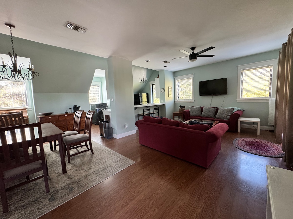 Nuestro Hayloft de un dormitorio tiene una increíble vista panorámica de la campiña de Texas con balcones a cada lado del apartamento. Sala de estar y comedor abiertos con una cocina maravillosa para cenas para dos o hasta 4 invitados adicionales. Hermosos muebles de dormitorio antiguos perfectos para tu día especial. Puedes traer a tu fotógrafo para hacerte fotos en los establos y terrenos. Podemos organizar que uno de nuestros preciosos caballos salga en las fotos o que vaya a dar un paseo.