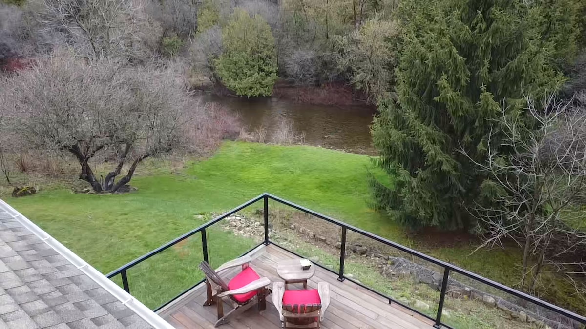 ¿Necesitas una escapada inolvidable? Esta acogedora casa de campo está enclavada en la naturaleza a lo largo del río Nottawasaga y tiene grandes puertas de paneles que se abren completamente para disfrutar de vistas dignas de foto y sonidos tranquilos del río. Una nueva e increíble chimenea al aire libre con sillas colgantes. Una acogedora chimenea de leña interior junto con un cómodo sofá cama que tiene un proyector encima para las mejores noches de cine. Suelos radiantes si no te interesa mantener un fuego, cocina totalmente equipada, wifi, aire acondicionado y lavadora/secadora.