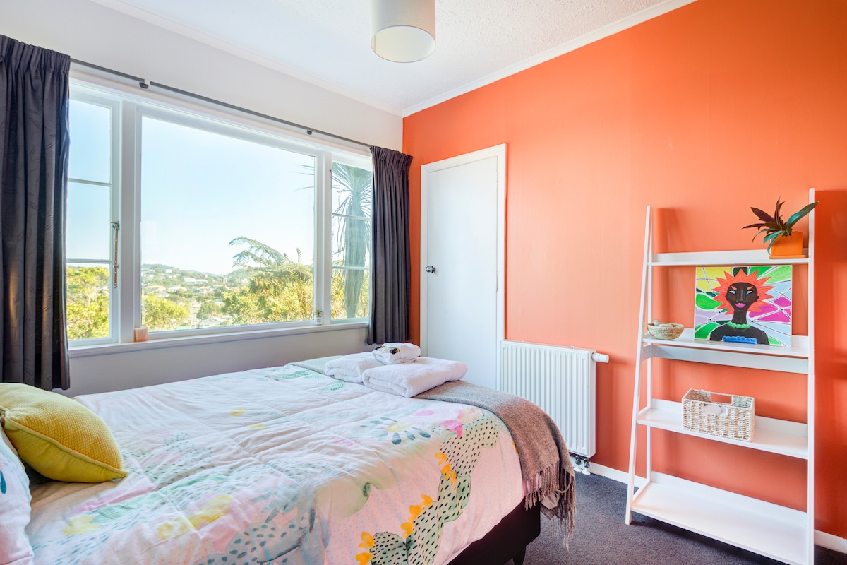 Una casa familiar cálida y acogedora ubicada a 10 minutos en coche del centro de Wellington, Nueva Zelanda. Aunque muchos de nuestros huéspedes son hombres gays y bisexuales, damos la bienvenida a cualquier persona que sea respetuosa con las personas queer, independientemente de su género. Tenemos una habitación disponible con una cama tamaño queen. El precio incluye desayuno estilo bufé, té y café. Comparte una cena con nosotros por un suplemento de 25 dólares neozelandeses por persona (vino incluido). Paga en efectivo durante tu estancia. Nota: Se requiere un aviso de reserva con un mínimo de 48 horas de antelación.