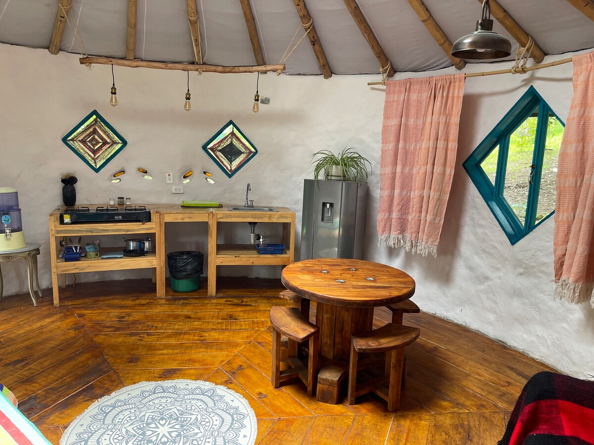 Escape to a peaceful retreat surrounded by nature, perfect for a romantic or family getaway! Inspired by Mongolian architecture, this cozy yurt is just 5 minutes from town and 1 hour from Bogotá. It features a comfy sofa, double bed, kitchen with stove, and a roof light for stargazing. Plus, your own bathroom with shower and closet. Relax, recharge, and be inspired by this unique nature-filled experience!