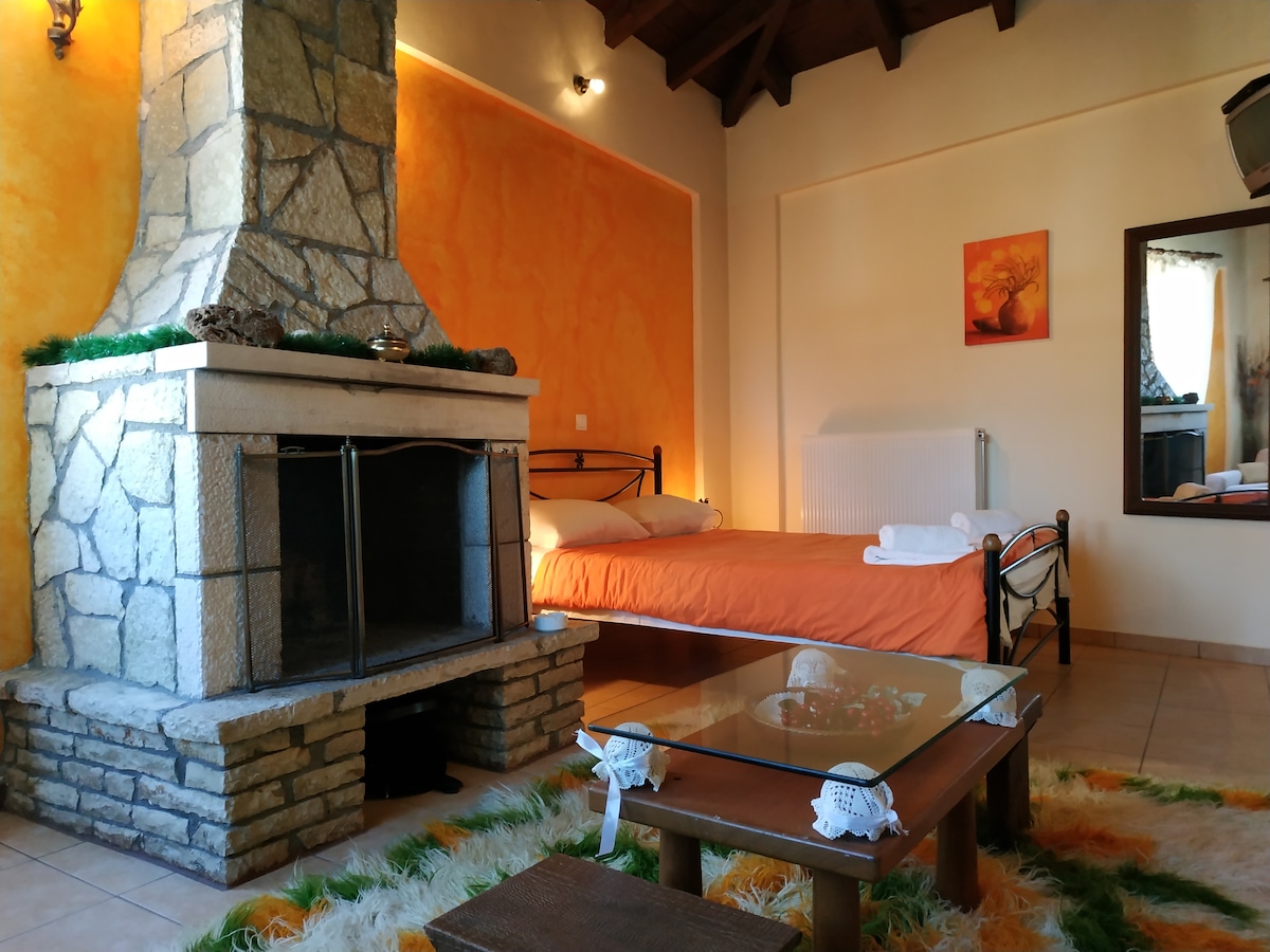 Estudio de una habitación de 30 metros cuadrados con una cama doble. En la ciudad de Kalavryta (a pocos minutos a pie del centro). Acceso al tercer piso a través de una escalera de piedra externa. Calefacción autónoma, chimenea de piedra, mininevera y estufa eléctrica para bebidas. El ático tiene un techo de madera obvio. No tiene balcón, pero hay balcones compartidos y un patio. Se proporciona leña para la chimenea previa solicitud. No está permitido hornear en la chimenea.