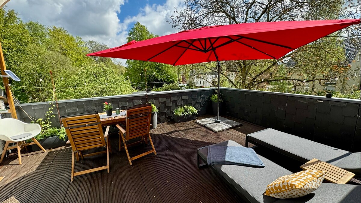Disfruta de la comodidad y el estilo en nuestro espacioso apartamento en Bochum. Con tres acogedoras habitaciones, que incluyen dos dormitorios y un sofá cama en la sala de estar, ofrecemos espacio para hasta seis huéspedes. Descubre las comodidades de una cocina bien equipada, un baño moderno con una ducha a ras de suelo y un inodoro con función de bidé. También podrás disfrutar de nuestra amplia terraza, que está equipada con una mesa y sillas, dos tumbonas, un sillón colgante y una sombrilla.