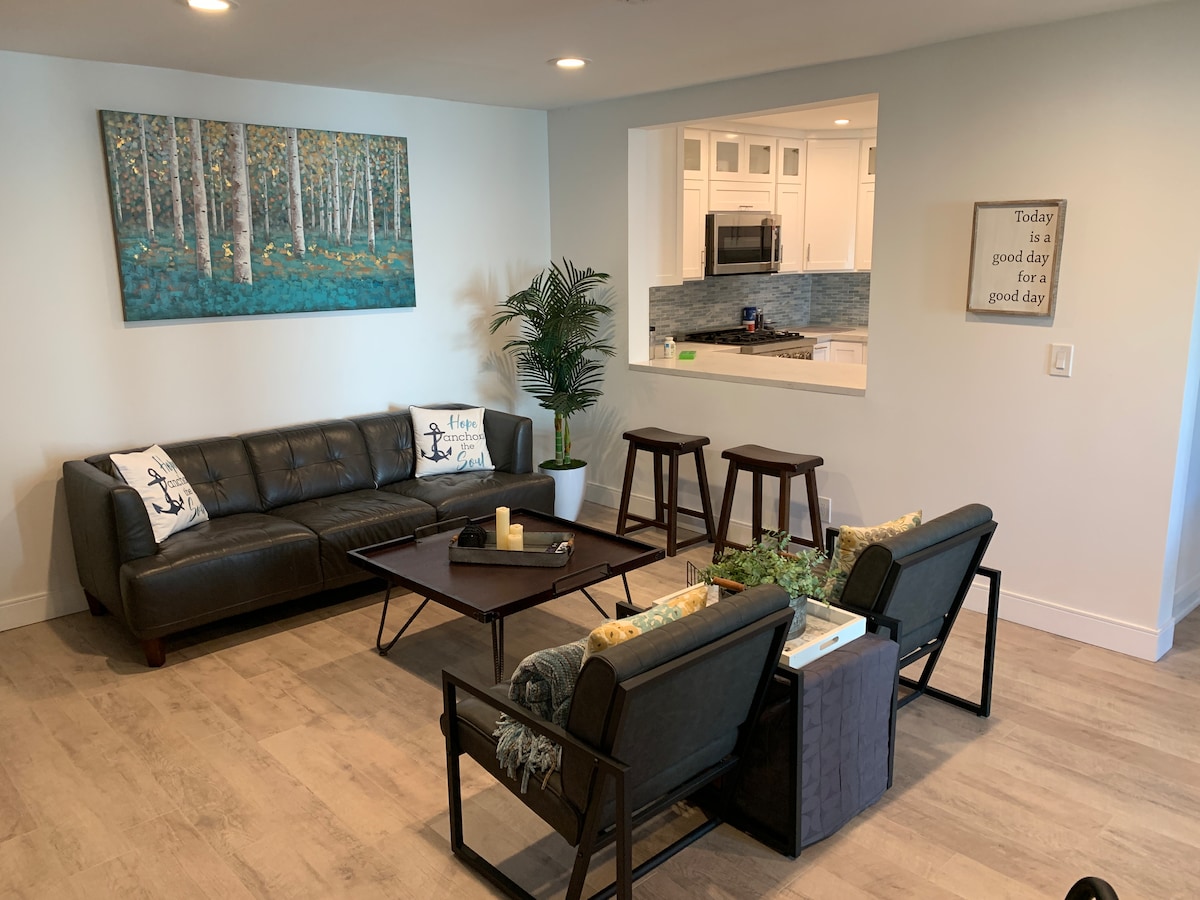 Te pedimos amablemente que muestres el mismo respeto, consideración y cortesía hacia nosotros y nuestro hogar que esperarías de los huéspedes en tu propio hogar. Nuestra suite de invitados está en la planta baja de una casa de 2 pisos mejorada y renovada construida en 1968. Las comodidades incluyen: entrada sin llave, dormitorio de 10'x11' con cama tamaño queen, baño privado, sala de estar privada con sofá seccional, YouTubeTV, Wi-Fi, cocina compartida, calefacción central y aire acondicionado (control del anfitrión: 69-72 F) y un escritorio.