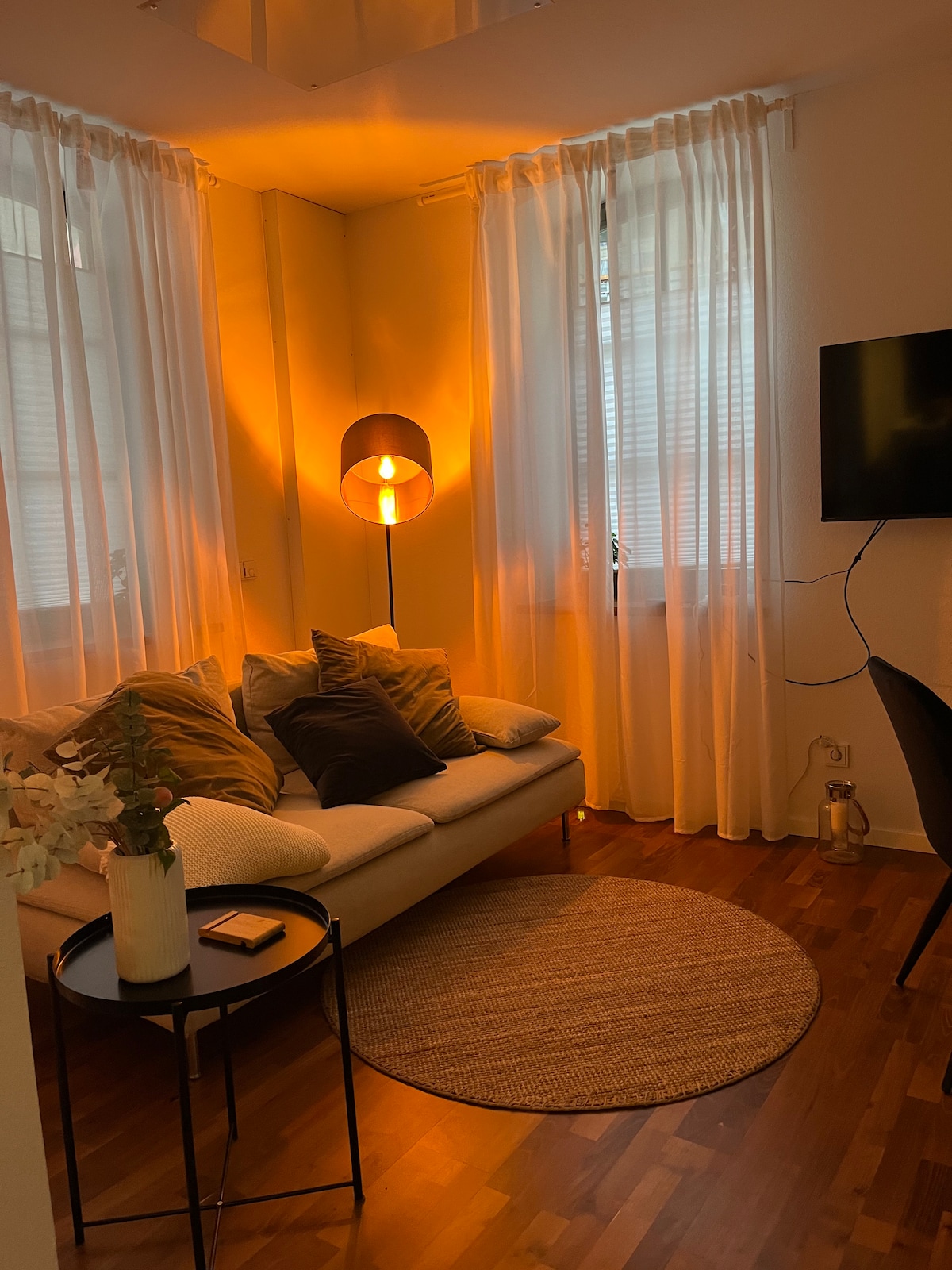 Ofrezco un apartamento bonito, acogedor y tranquilo para alquilar. Está equipado con persianas enrollables, alfombras y calefacción por suelo radiante. 2 camas individuales y un sofá cama muy cómodo para 2 personas sirven como lugar para dormir. Una mesa y 4 sillas forman el centro para una ronda acogedora. En la minicocina hay un fregadero, 2 hornillas, nevera, tostadora, microondas, campana extractora y mucho más. En el baño hay ducha, inodoro y lavadora-secadora.