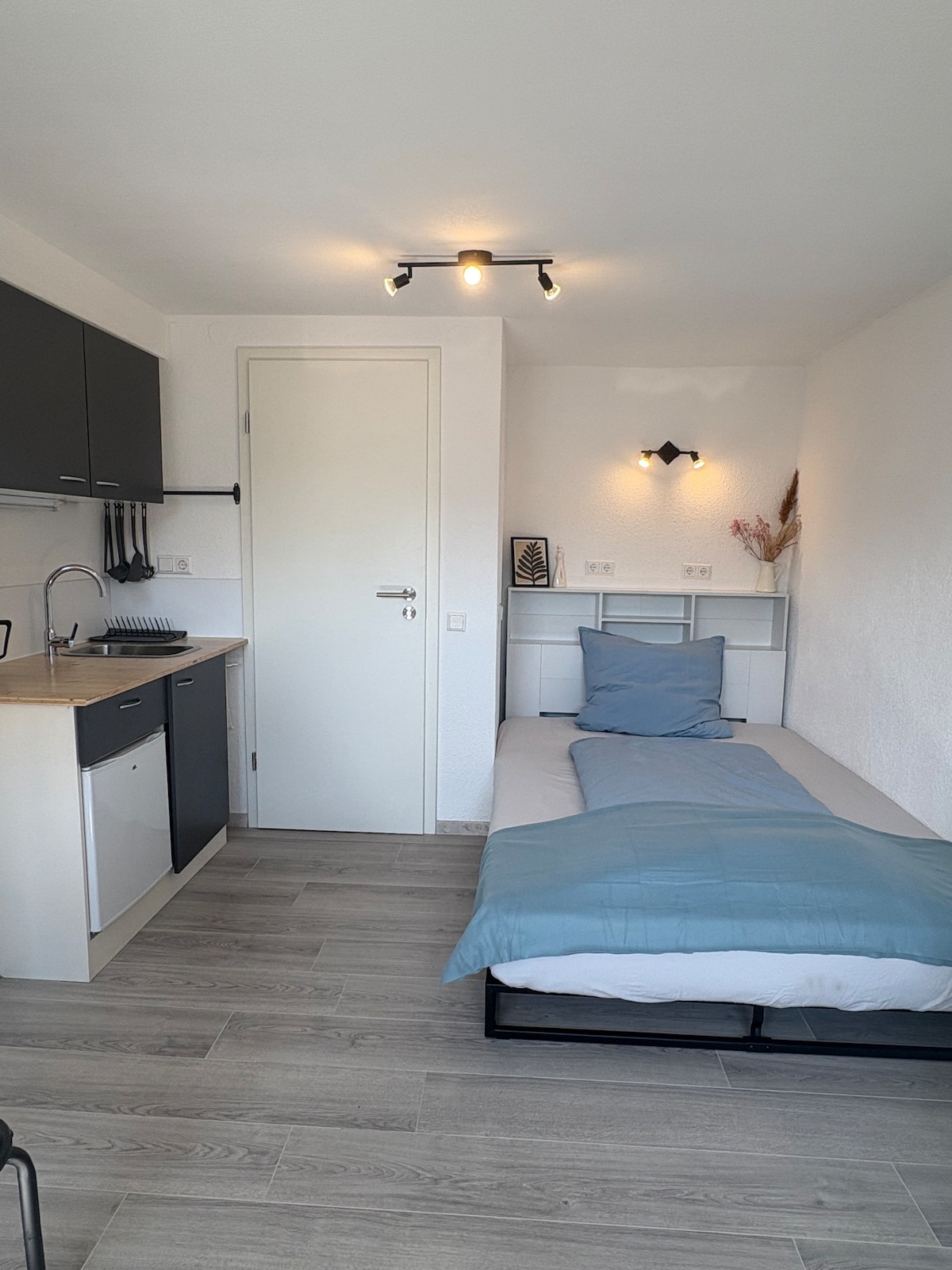 Unserer kleine 1-Zimmer-Wohnung ist modern und gemütlich eingerichtet. Im Schlaf-/Arbeitszimmer befindet sich neben Doppelbett und Schrank auch ein Arbeitsplatz mit Bürostuhl sowie ein Flatscreen-TV mit Sessel. Gerne könnt Ihr unser Gäste-WLan nutzen. Das kleine Badezimmer ist hochwertig ausgestattet und hat eine ebenerdige Regendusche. In der Küche findet Ihr alles für den täglichen Gebrauch (inkl. Spülmaschine, Herd, Ofen und Mikrowelle).
