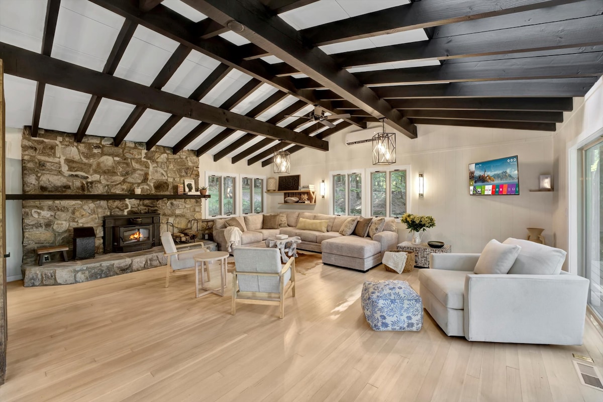 *Las reservas de invierno deben tener un vehículo de 4 ruedas o AWD. Esta cabaña única limita con el área recreativa nacional Delaware Water Gap. Camina justo detrás de la cabaña, a través del bosque, hasta Dingmans Creek. Una corta caminata río arriba conduce a George W. Childs Park con 3 cascadas, un sistema de senderos rústicos y miradores. Una caminata más larga río abajo te llevará a Dingmans Falls. DWGNRA ofrece natación, pesca, senderismo, ciclismo, piragüismo y kayak, todo a pocos minutos de la cabaña.