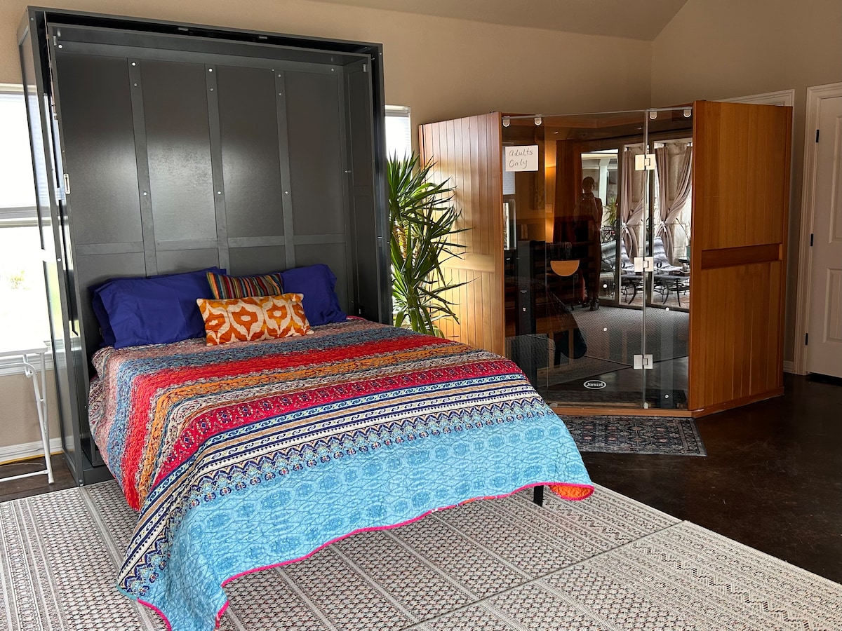 Le damos la bienvenida a su tranquilo refugio con sauna en la habitación. Disfrute de una cocina pequeña con microondas, mininevera, cafetera de émbolo, hervidor eléctrico y olla eléctrica. Ofrecemos té, café y matcha para su disfrute. El medio baño cuenta con lavamanos e inodoro, además de una ducha privada al aire libre. Nuestros cómodos alojamientos incluyen una cama plegable Queen con espuma viscoelástica. También disponemos de una cuna gemela para un huésped adicional. Si desea que la preparemos para su estancia, infórmenos con antelación. El espacio incluye un televisor inteligente.