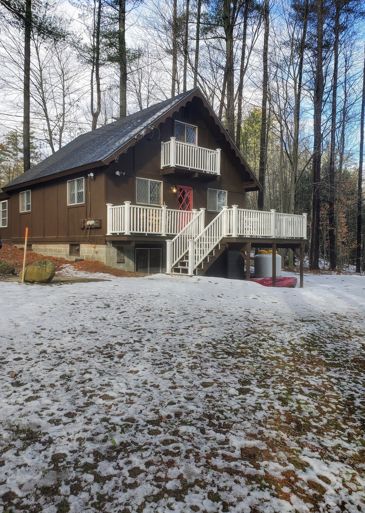 Ubicado en los bosques de Stoddard, NH, Rocky Ledge es un refugio familiar durante todo el año. Nuestra acogedora cabaña de madera tiene 3 dormitorios, 2 baños y una sala familiar de nivel inferior perfecta para relajarse. Disfruta de una cena al aire libre en la gran terraza de 3 lados y remata tus días con sesiones de s'mores en el fogón. La navegación, el senderismo, la natación y el esquí están a pocos minutos. O bien, ponte cómodo en el interior y disfruta de películas, rompecabezas y juegos. ¡Rocky Ledge admite mascotas! Damos la bienvenida a hasta dos perros con una tarifa plana de $50 por mascota.
